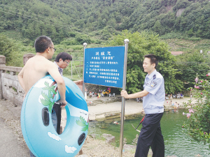 天气热,大批市民涌入自然水域消暑纳凉,然而随着河畔人气的增加,盗窃案也时有发生,特别是车内财物时有被盗现象发生。为了提高广大群众的安全防范意识,7月20日,嵊州市公安局甘霖派出所民警在辖区游泳爱好者相对集中的石道地自然河流一带设立了防盗警示牌,提醒并告诫市民:珍爱生命,不要在水库里游泳。同时,警方定时对辖区水库及其他自然水域进行安全巡逻。