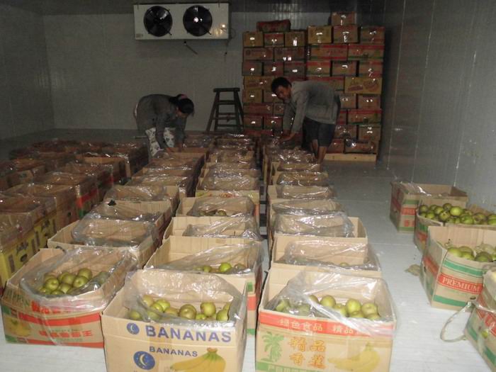 梨头园内建冰库,好处实在多:一是台风来临不用慌。在以往没有建冰库的年月里,每当在7、8月份台风来临之际,主人姚鑫永夫妇真是担心害怕,有许多时候真是不知所措,把梨头摘下来吧?没有地方冷藏,不摘吧?眼看着来临的台风就会把成熟的梨头吹落在地,跌得粉碎,一钱不值;二是新鲜。如今在梨头园内建了冰库,从树上摘下来的梨头,轻放于盒子里,完好无损;三是省去了途中的搬运。在没有建冰库的时候,场主姚鑫永,为了延长销售时间,往往要把采摘下来的梨头运到嵊州市区的营业冰库里面去冷藏,其费用之多就别提了。为了做大做强翠冠蜜梨产业,提高著名度,如今石隆山姚鑫永的家庭农场,积极利用这三面环山,一面靠水的天然无公害地理优势,从今年3月份起,已经向国家有关部门申报了无公害基地,接下来,他还打算注册石隆山翠冠蜜梨商标。结合新时代下的新形势,种植无公害水果,努力让广大消费者吃得放心、开心,让有限的土地增收、增效。