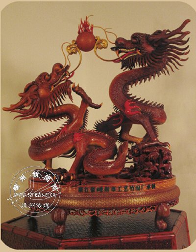 “这件曾被江泽民赞赏为‘有中国民族特色’的作品‘奔马’,这件是作为邓小平访美礼品、陈列于美国白宫的‘山鹰’,这个是以徐悲鸿‘奔马’为灵感创作的作品,还有这个是‘岳飞’……”对着展厅里的一件件活灵活现的精美之作,刘长泉兴奋地一一为我们作着介绍,这时他的目光停留在一幅照片上,我们抬头看去,照片上是一个双龙戏珠造型的竹编工艺品,他无比自豪地说道,“这个就是为庆祝1999年澳门回归祖国、由嵊州竹编工艺厂制作、代表浙江省人民政府赠送的礼品——沧海还珠。那年,浙江省政府为迎接澳门的回归,向各县市征集礼品,时任厂长的我在接到任务后,即刻集聚了20余位技艺高超的竹编艺人,从开始构思,到设计出稿,到动手编织,最终成品,历时八九个月,这期间倾注了所有参与人员极大的心血,这件作品不仅造型栩栩如生,更是寄托了深刻的寓意,两条蟠龙既代表中国的母亲河——长江与黄河,又代表龙的传人——华夏炎黄子孙,是我们伟大祖国的象征。宝珠,则象征南海明珠澳门,这颗脱离母体的宝珠,在祥云水浪的沧海中涌出,重新回到伟大的母亲——祖国的怀抱,东方巨龙喜迎沧海遗珠的回归。当时,与我们这件作品一起选送的还有东阳的木雕、临海的玻璃雕、青田的石雕,经过层层筛选,最终沧海还珠脱颖而出,获得了时任浙江省省委书记张德江的极高评价。被誉为‘浙江第一、中国第一、世界第一’!”