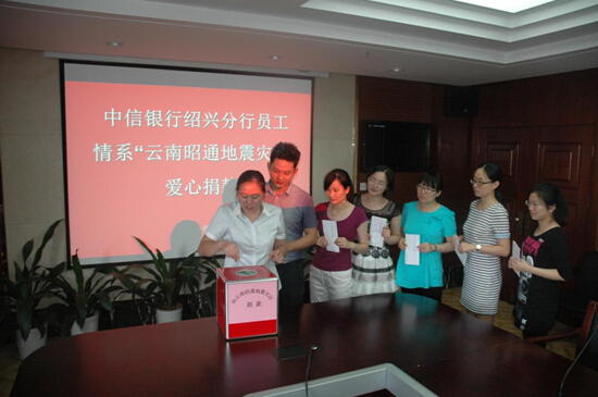 8月3日,云南昭通鲁甸县发生6.5级地震,造成当地大量人员伤亡和财产损失。为支援灾区人民渡过难关,积极履行中信银行社会责任,中信银行绍兴分行号召全行干部员工向地震灾区捐款。