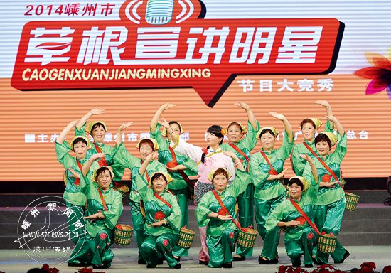 昨日下午,由市委宣传部主办、市广播电视总台承办的“2014嵊州市草根宣讲明星·节目大竞秀”活动在天乐文化宫举行(如图)。经前阶段推荐报名,全市共有61个节目参加了本次大竞秀活动,比赛将按现场比赛成绩高低评选出全市十大“草根宣讲明星(节目)”和20个“优秀草根宣讲员(节目)”。