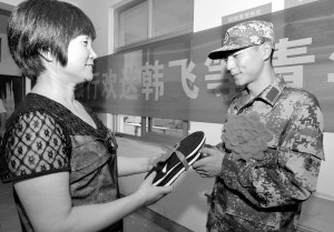 嵊州市金庭镇灵鹅村孤儿韩飞再过一天就要去部队了,9月10日下午,嵊州市浦口街道的王飞琴特意为韩飞送来了一双布鞋。