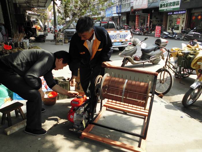 据店主马炎明说:“今年这种新产的单人“省油王”汽油打稻机特别受到广大农户的青睐,这种用汽油作燃料的单人动力打稻机,携带方便,一台约15公斤左右的汽油动力机随时可装卸;还有燃料成本省,脱粒一亩田稻谷,约在10元汽油钱,再说机器也不贵,连同打稻机、油壶一起只要860元,所以,购买者络绎不绝。”