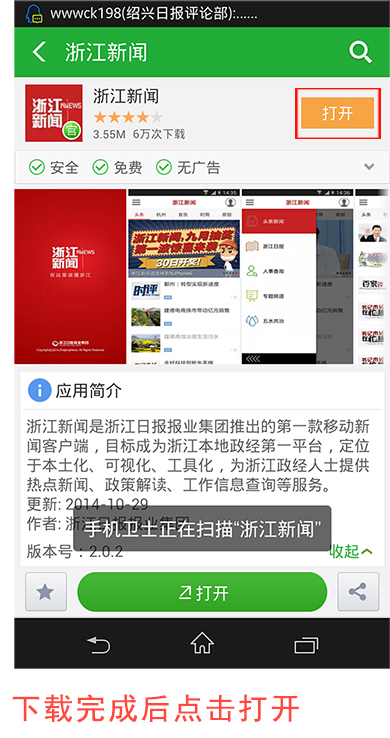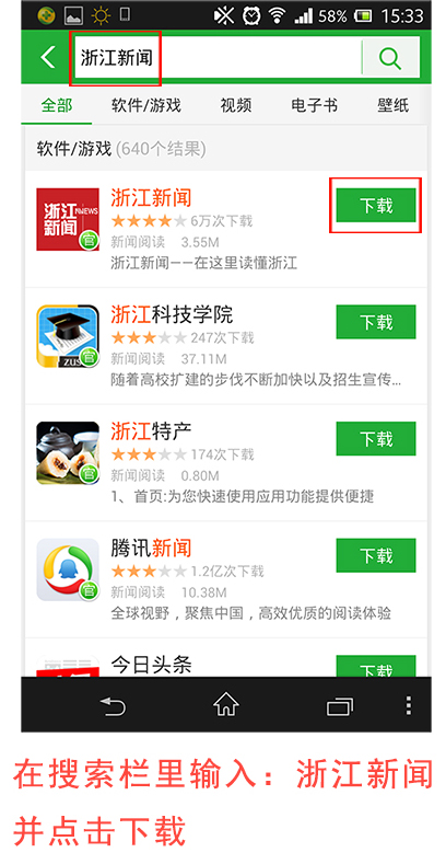 安卓用户通过扫描二维码或在各大市场(如豌豆荚、360手机助手、小米应用商店、应用宝、应用汇、安卓市场、安智市场、机锋市场、91手机助手、百度市场等)搜索“浙江新闻”下载(点击下载http://zj.zjol.com.cn/d/)。