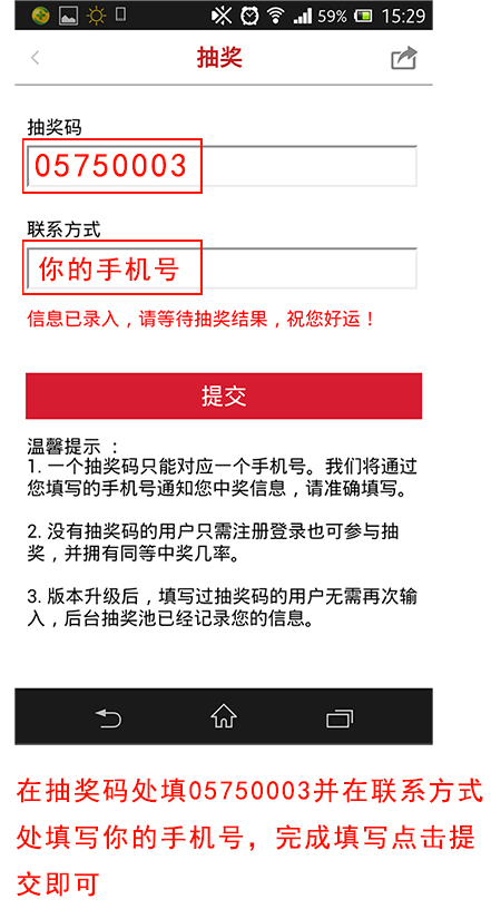 点击客户端首页右上角 标志,点击“填抽奖码赢大奖”,抽奖码一栏中填写“05750003”,联系方式一栏填写参与抽奖手机号,点击提交。OK!