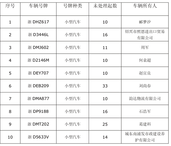 嵊州市5起以上违法未处理车辆列表(十)