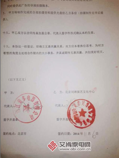 美多电器与刘涛签订的代言合同