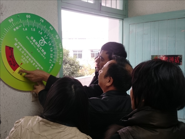 近来,蛟镇中学小会议室内,不时有教师进来,对着墙上的一个圆盘转来转去指指点点。那张圆盘叫体重指数大转盘,老师们通过转动里面的转盘,找到自己身高的数据,然后转动该数据,把该数据与外圈表示自己体重的数据对应,即可在下方的镂空处得到自己的体重是偏瘦、偏胖还是合适的结论,让师生既有趣又快捷地检验了自己身体的胖瘦状况。