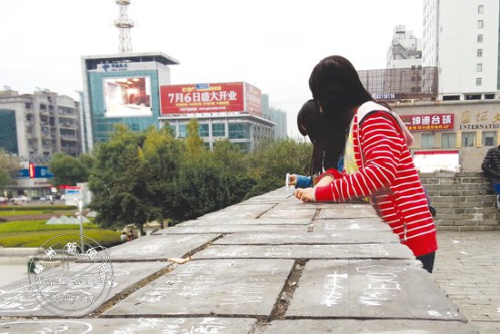 城墙的墙面上,几乎每块砖石都被刻了字,或绘了图案,内容无非是“爱恨”之类(此前本网曾有相关报道)。我市古城墙有1700多年历史,现尚存城南部分城墙,为明嘉靖三十四年修筑,是省文保单位。 (小山)