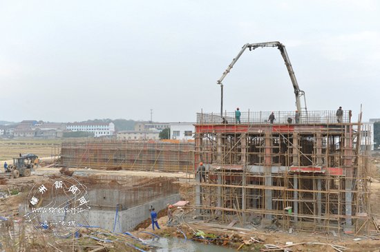 总投资5420万元,总用地面积25亩,设计污水处理能力5500吨/日(远期为1.8万吨/日),铺设污水管网10公里,3个泵站,采用先进的生态组合塘工艺,2014年计划投资2500万元,完成主体工程及设备安装调试。项目自今年6月份开工动建以来,已完成投资1900万元,完成年度投资额的76%,厂区部分主体工程大部分已经完成,综合楼和综合用房都已经结顶;A/O池已完成265个桩基、底板浇筑和两面墙体浇筑;10米深沉井已完成一半,剩余一半已完成浇筑,即将下沉;污泥脱水机房和综合处理池正在进行支模,即将结顶,另外10公里污水收集管网已完成设计工作,年底进行招投标工作,预计在年底前能全面完成主体工程建设,在2015年上半年能完成管网铺设并投入使用。