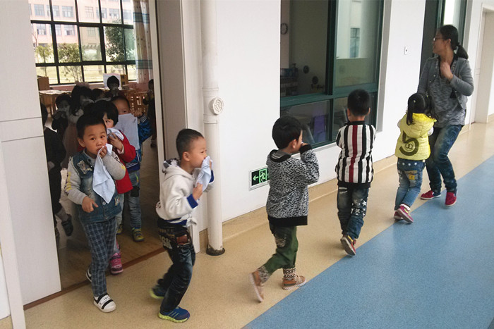 下午15:15分左右,孩子们正在专心地上课,忽然听到紧急的警报声,各班教师迅速按紧急预案的疏散线路带领幼儿拿起湿毛巾,捂住口鼻,分两道楼梯迅速且有序下楼。很快孩子们集中到操场安全地带,教师迅速地清点人数,并向总指挥报告。整个疏散活动只用了2分多钟。演习结束后,各班教师带领幼儿有序回到教室,各班教师给幼儿讲述地震、火灾等灾害发生时幼儿应该如何逃生等知识。