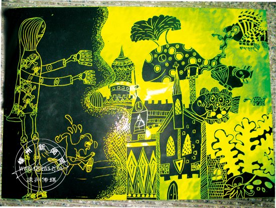 多以创想为美术创作的源泉。平时在多了解科学知识、多读一些科技书籍、时常关心科学发展动态、及时了解科学发展的新动向以后,经过老师的点拨、引导,孩子们对科学的渴望越加强烈,形成了一种良性循环。美术组的老师们根据这种现象,因势利导,循循善诱,进一步提高孩子们的创想能力。根据孩子们了解的科学知识,老师们还开展了“联想、幻想、配画”这“三部曲”的教育。比如指导孩子这样想:科学家研究出了纳米技术,我们就可以想象用纳米技术来为人类治病,用纳米技术来制作像蚂蚁一样的机器人;研究出了“克隆”技术,就可以幻想我们能把爱迪生的大脑“克隆”出来,并且给我们换上,我们就可以创造、发明许多新技术,为人类造福。