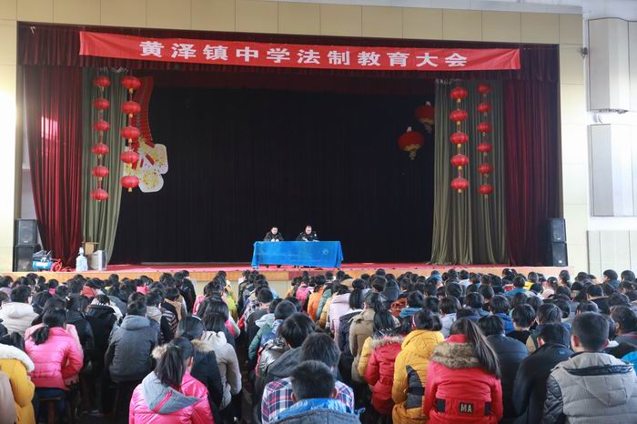为加强对青少年普法教育,更好地增强广大师生的法制观念,进一步促进师生遵纪守法的主动性和自觉性,12月17日,黄泽镇中学在风雨操场举行法制教育报告会。黄泽镇派出所民警刘剑和黄泽镇禁毒办专职社工干部到黄泽镇中学向师生们宣传法律知识。