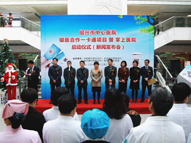2014年12月26日,绍兴市中心医院在门诊大楼成功举行了银医合作一卡通项目暨掌上医院启动仪式新闻发布会,绍兴市柯桥区祝静芝副区长、绍兴市柯桥区卫生局马国勇副书记、绍兴市人民医院郭航远院长、绍兴市中心医院马高翔院长、中信银行绍兴分行陈黎敏副行长、中信银行绍兴轻纺城支行宋丽坤行长及另外两家合作银行的领导参加了发布会,绍兴市中心医院寿炎明副书记主持了本次启动仪式新闻发布会。