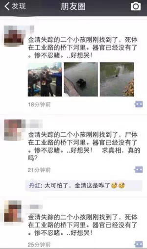 昨天下午开始,台州坊间流传说,金清失踪的两个孩子被发现杀死在河道里,这个消息经过微博和微信等圈子疯传。钱江晚报记者昨晚和金清派出所值班民警核实,对方明确答复没有这样的情况。随后又向走失小孩的父亲核实,也确认消息是假,孩子还没有找到。