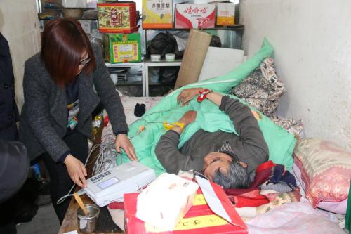 钱大伯患心脏病、高血压已多年,身体一直不太好,又在4年前突发脑梗塞,落下了后遗症,造成一侧肢体偏瘫,行动不便,大多数时间以床为伴,极少出门。卫生院组织下村免费健康体检时,他也无法前往,从没有好好的检查过身体。这次责任医生们携带了心电图机、血压计、血糖仪等医疗仪器上门,针对性的、耐心细致的为钱大伯作了全身检查,并完善了个人健康档案,最后根据大伯的身体状况对用药情况和健康生活方式进行了指导。