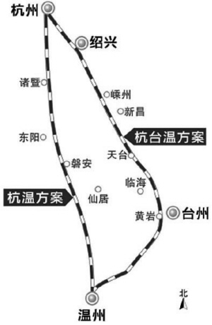杭温高速铁路,又称杭温城际铁路客运专线。早在2011年,温州市发改委就提出了这一方案,并被省发改委列入了“十二五”规划。杭温铁路的走向有两个方案,一是沿着上三高速线从杭州、台州至温州,另一个方案是沿诸永高速公路从杭州到温州。但杭温铁路究竟走“上三线”还是走“诸永线”,因为涉及到温州、绍兴、金华、台州等的利益,因此各地的议论非常多。昨天,记者也就此采访了市交通局有关负责人。他表示,目前杭温铁路还处在规划阶段,绍兴的态度是积极争取,做好相关的前期工作。
