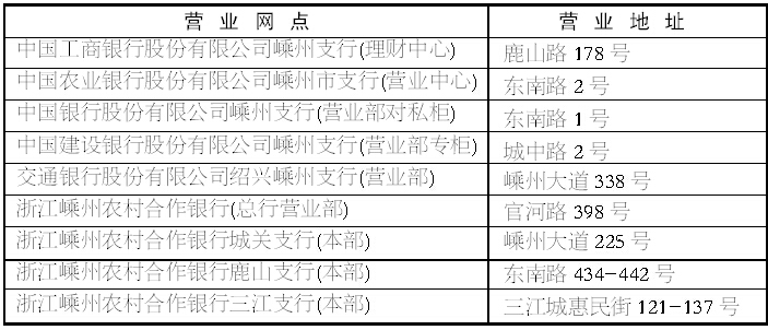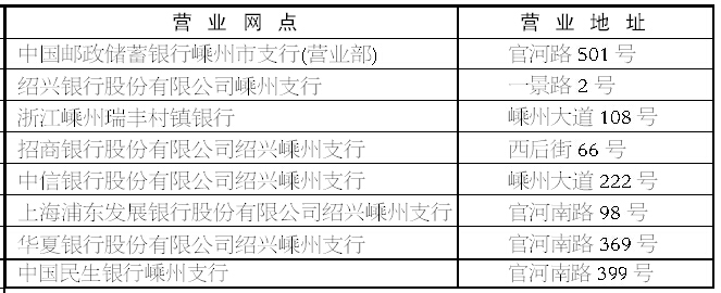 根据国务院办公厅关于节假日休息安排的通知精神,市金融同业协会经与市级各商业银行、农村合作银行、邮政储蓄银行协商并报备绍兴银监分局嵊州监管办事处,决定春节期间(2月19日至2月21日),在市区安排相关银行的17家营业网点正常对外营业,其他网点暂停对外营业,办理业务请到下列相关银行机构营业网点,请广大客户相互转告。现将部分正常营业网点详情公告如下: