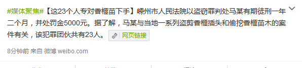 本网从嵊州法院微博获悉,市人民法院以盗窃罪判处马某有期徒刑一年二个月,并处罚金5000元。据了解,马某与当地一系列盗剪香榧插头和偷挖香榧苗木的案件有关,该犯罪团伙共有23人。