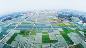 昨日,从空中拍摄的嵊州市鹿山街道江夏村一角。嵊州市鹿山街道江夏村有3000余亩双季茭白基地,早春时节温差大,是保温培育茭白苗的关键时期,一垄垄育苗的薄膜棚整齐地排列在田野上,绿白相间,春意盎然。