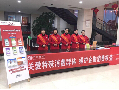 2015年3月12日-18日,中信银行杭州分行积极响应浙江省银行业协会号召,在辖内全面组织开展“关爱特殊消费群体维护金融消费者权益”----“3•15”消费者权益保护宣传周活动。