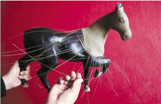 嵊州竹编传承人袁亚琴在制作竹编“骏马”。