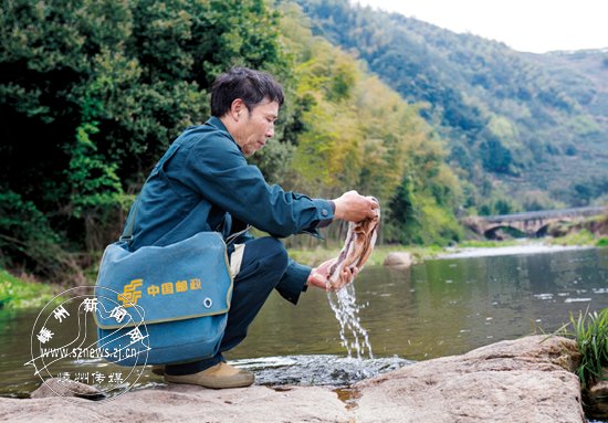 清晨6点多,晨光刚刚照进里南乡叶村邮政代办所,60岁的卞官苗捆好两大包邮件,已经出发了。一边是耸立的岩石峭壁,一边是莹绿如玉的小乌溪江,穿着绿色制服的卞官苗骑行于弯连弯的山路中,像一条灵动的鱼。