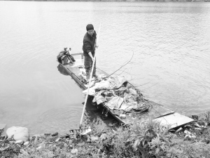 4月20日早上5点,嵊州市甘霖镇苍岩村的俞华君就起床了,划着一艘钢板做的船筏,开始巡视澄潭江,看到河面有垃圾,就捞起来放在船筏上。一直到中午11点,他终于巡逻完了1.5公里的责任河段,捞起了半筏子的垃圾。