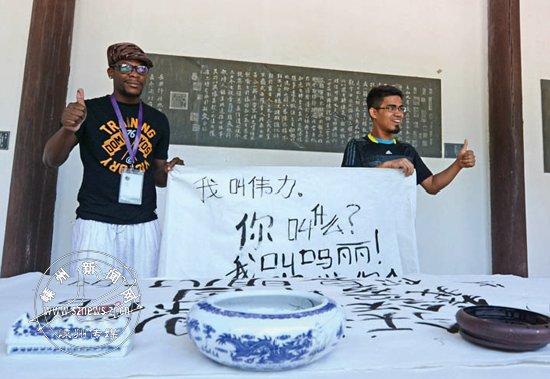 在书法朝圣节现场,在书圣殿两侧廊檐下,一群参加“走唐诗路、书唐诗情”名家唐诗之路采风行活动的外国留学生也在舞文弄墨,吸引了大家的目光。