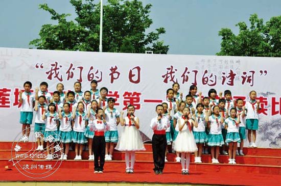“粽子香,香厨房;艾叶香,香满堂……”日前,开发区莲塘中心小学的田径场上,1000多名师生和100来名家长齐聚一堂,共同参加了该校举办的首届美文诵读比赛活动,台上朗朗上口的诵读声和优美动听的音乐声,与台下此起彼伏的欢呼声连成了一片,好像一曲曲交响乐回荡在校园。