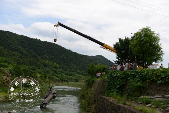 下午13时,当记者到达事故现场时,只见吊车正在进行救援的准备工作,通过周围围观村民的指点,记者才在江中看到了已经完全被江水淹没的事故车。