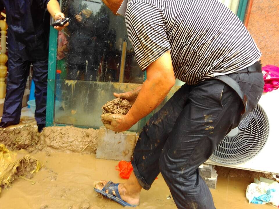 经济开发区多处路积水,最深出没过膝盖,路上有车抛锚,路边店家忙自制临时堤坝。