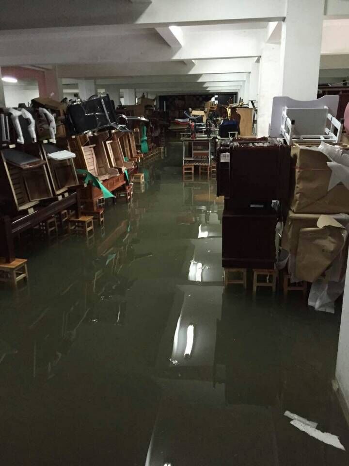 三界镇综合大楼的家具城严重进水,地下仓库水位高度达五十公分,市消防官兵从上午八点到现在还在帮助搬运家具,抽水。