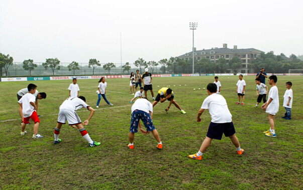 在训练现场,孩子们被分成两个队伍,进行绕障碍带球、定点射门等基本训练,十分钟不到,20名小球员早已汗如雨下、酣畅淋漓。而看到孩子们在场上激烈拼抢的家长们也兴致高昂地在一旁加油助威,现场气氛非常热烈。一个孩子告诉记者:“我的偶像是贝克汉姆,现在放暑假了,可以尽情放松,我要好好学习踢球技巧。”