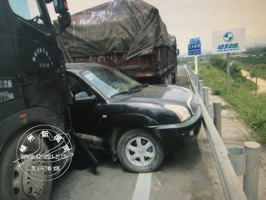 在事故现场,两大货车的车头和车尾分别与小型越野车的车身还紧紧“咬”在一起。同时把小型越野车车身挤压得变形,卡在中间无法动弹,地上到处是撞碎的车窗玻璃碎渣。