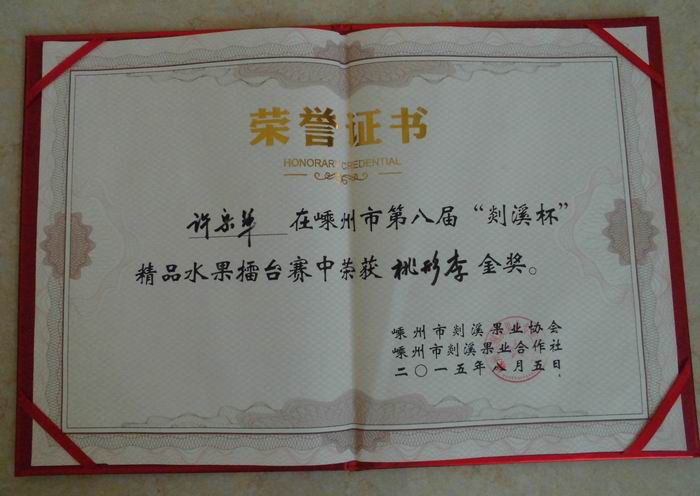 8月5日上午,由市农林局、剡溪水果协会、鹿山街道等单位联合举办的一年一度的嵊州市“剡溪杯”精品水果擂台赛在丰尼山庄举行。来自全市各地的桃形李、桃子、梨头、葡萄等水果协会会员中的精品种植户,在各分会的自评及推荐下参加了本次大赛。经过科学的糖度检测及果形大小、颜光色着等项目的评比,由黄泽镇青石桥村许岳军种植并选送的桃形李以19点多的糖度,压倒其余参赛者,荣获2015年度水果大赛金奖。评奖的揭晓,震惊了全场的所有与会成员,好多人说着同样的一句话,“原来今年最甜的桃形李在黄泽!”