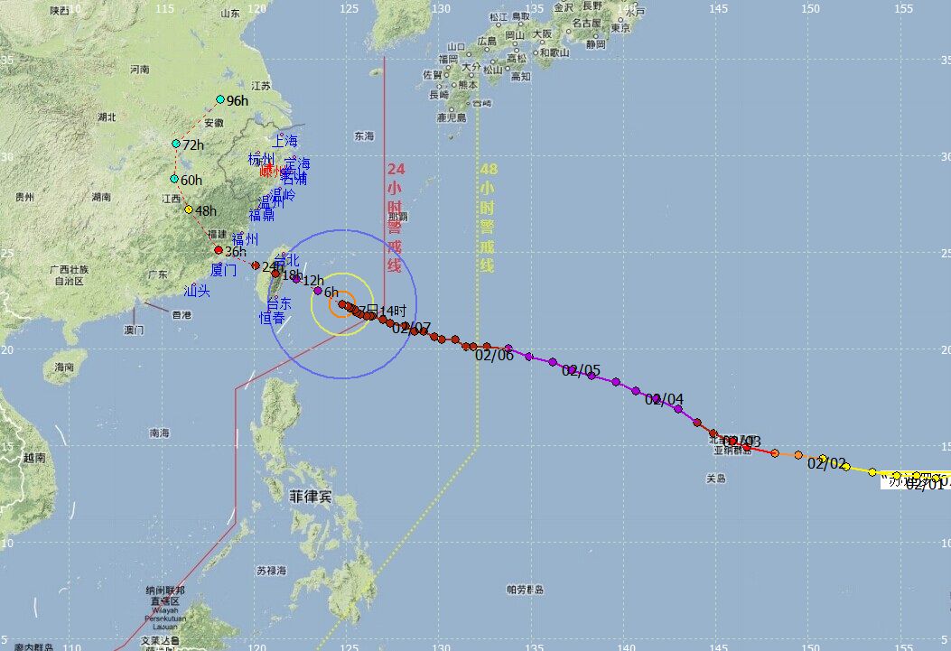 中心位置:今天14时中心位于距离嵊州东南偏南方向大约910公里的洋面上,也就是在北纬22.3度,东经124.8度