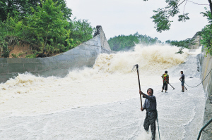 受台风“苏迪罗”外围影响,嵊州北漳镇出现罕见大暴雨。为确保水库及下游群众安全,该镇多个水库持续泄洪。不过,这也引来很多在泄洪区捕鱼的村民。图为10日下午,上东水库泄洪现场,几位村民不顾劝阻仍在泄洪通道用铁耙捕鱼。 (记者张亮宗摄)