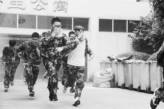 8月26日下午,嵊州中学参加军训的800多名高一新生,在消防教官和教师的指挥下,开展了火灾紧急疏散演练,迅速、有序地撤离到指定地点。 (安虹伟 张亮宗摄)