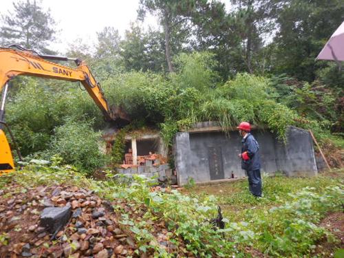 9月22日,鹿山街道组织城管办、殡改办、工作片和拆迁队工作人员60余人,共动用挖机1台、钻眼机4台、扬撬和锄头若干,对位于方田山村和东大湾村的15穴违建坟墓进行集中拆除。