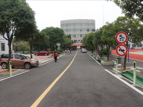 一正一背两块交通警示牌,是为了警示进校车辆,也为了提醒出门的机动车要遵守规定。不仅如此,在转弯处,除了安装同样的警示牌外,还专门安装了反光镜。这些设施的安装,不仅美化环境,规范化行车,也因为警示牌和开学初改造好的沥青路面相得益彰,教师开车进来仿佛进入高速公路,让教师马上想到了交通规则,进一步增强了交通安全意识。另外也对临时来校的车辆起到警示作用。
