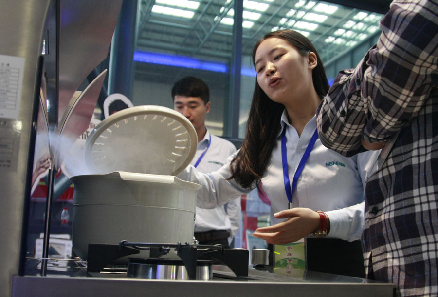 10月27日,观众在展会现场参观电机、厨具设备。