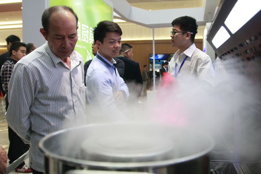 10月27日,观众在展会现场参观电机、厨具设备。
