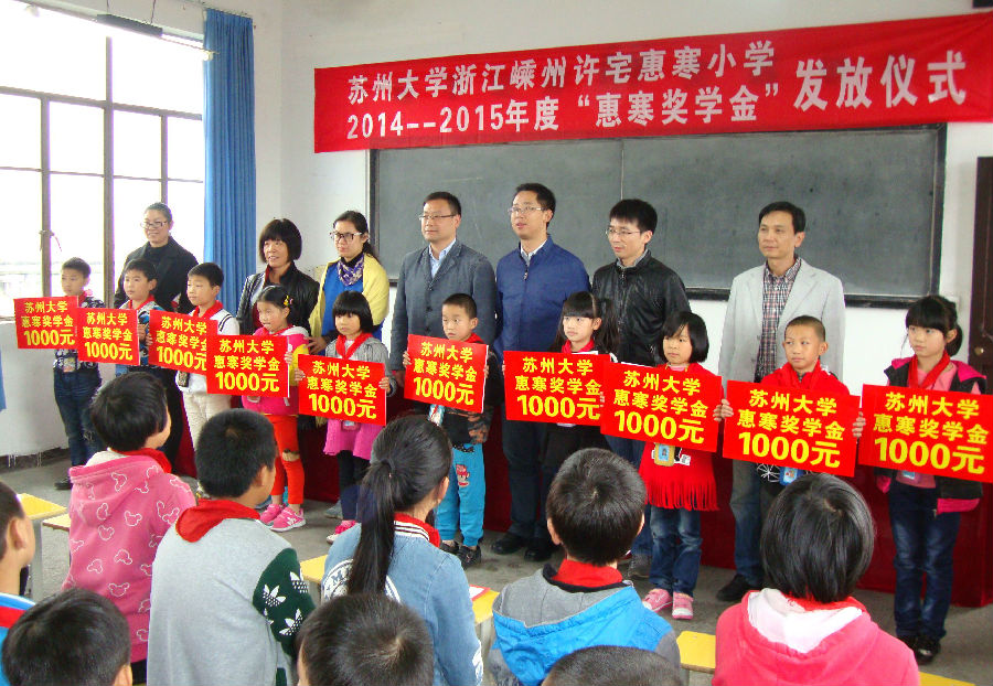 11月20日下午,苏州大学“惠寒”奖学金颁奖仪式在许宅小学举行。学校20位品学兼优的学生获得了“惠寒”奖学金。苏州大学的领导和老师前来参加颁奖仪式。