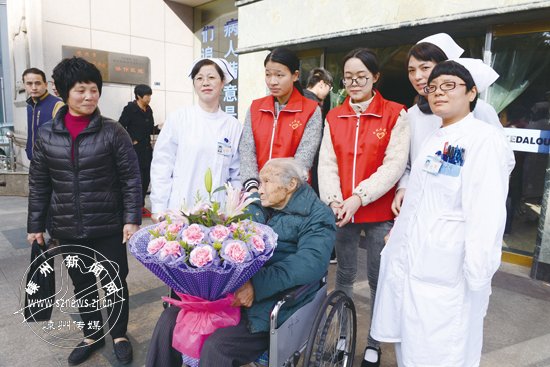 原来,这位中年人是肛肠外科收治的超高龄病人——马奶奶的孙子,当天是马奶奶康复出院的日子。马奶奶是甘霖镇白泥墩人,出生于1916年1月,是一位不折不扣的百岁老人。