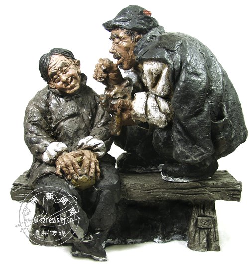 泥塑《挖耳朵》从普通百姓的真实生活出发,以极端夸张而又带抒情味的形式,表现了人物丰富多彩的奇特外在形象和内在的隐秘世界。