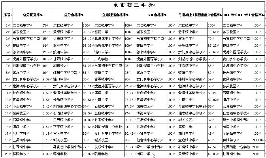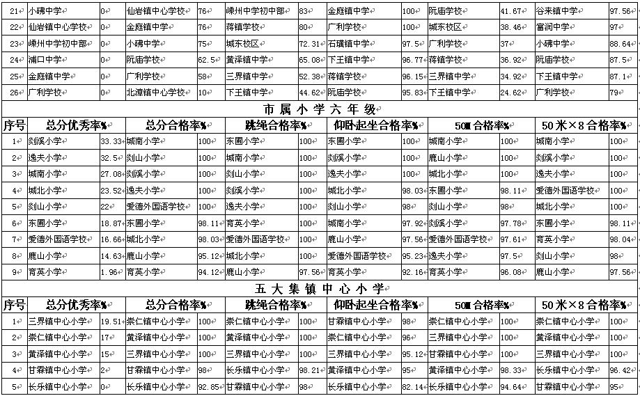 为了认真贯彻落实省委省政府《关于加强青少年体育增强青少年体质的实施意见》(浙委〔2008〕11号)和《浙江省教育厅办公室关于建立学生体质健康状况通报制度的通知》(浙教办〔2010〕149号)精神,进一步加强学校体育,深入推进学生阳光体育运动,切实增强青少年学生体质,依照省教育厅规定,结合本市实际,我市于2015年12月底对全市初三学生、市属小学及五大集镇中心小学六年级学生体质健康状况进行了抽测,抽测情况如下。