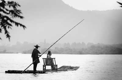 乘一只竹筏,漂在剡溪之上。两岸层峦逶迤,满目青翠。夕阳洒在水面,映出一片红晕,染红了撑船人佝偻的背影。竹竿轻柔地划破水面,湍流的水花从缝隙中渗上来,打湿了鞋底。对岸的婆娑柳条、青翠竹叶、茵茵青草逐渐清晰。