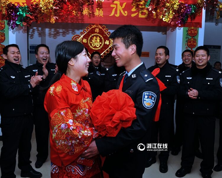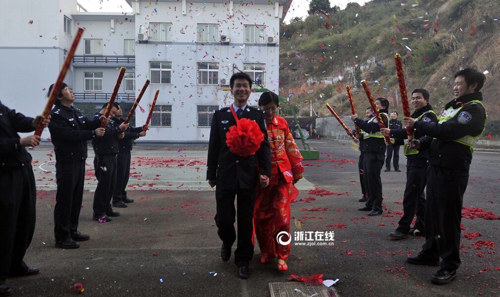 1月24日傍晚,绍兴高速交警支队二大队在大队嵊州警营,专门为民警徐哲伟、新娘戴娇颖补办简朴的婚礼。