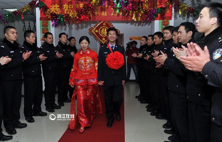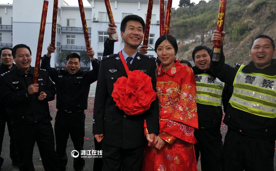 1月24日傍晚,绍兴高速交警支队二大队在大队嵊州警营,专门为民警徐哲伟、新娘戴娇颖补办简朴的婚礼。